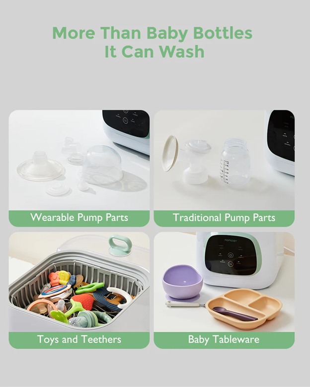 Soap and hot water remain your first line of defense. Your hands need thorough washing with soap for at least 20 seconds before handling any pump parts or milk collection. Each pump part that touches milk requires cleaning immediately after use – leaving parts unwashed until evening allows bacteria to grow and makes cleaning more difficult. For convenient and thorough cleaning, you can use an all-in-one sterilizer and dryer like the Momcozy Baby Bottle Washer and Sterilizer that washes, dries, and sterilizes pump parts efficiently.