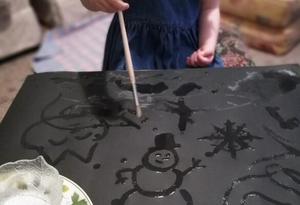 Now you (don’t pretend you didn’t want to do this, too) and your sweet babies can paint pretty pictures, but the magic happens when they dry! The salt crystals re-solidify, and look all icy and magical!